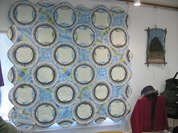 今年は3日間の開催でした、上の写真は会場のレストカフェ&ギャラリーH2。 建物の向かって左がカフェ、右がギャラリーになっています。 そして今回それぞれの展示の様子。 写真左・中央:松本幸枝/織物作品↓ 写真右:玉井加奈枝/パッチワーク作品↓