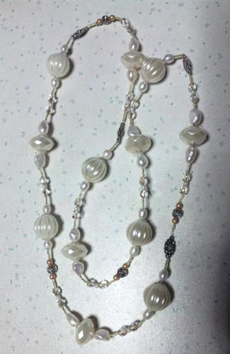 中村さん:白を基調に淡水パールやアクリルビーズをつないだロングネックレスを制作されました。