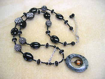 久保さん:ラインストーン風のアクリルビーズをポイントに、楕円やドーナツ型のオニキスを使ってモノトーン仕上げのワイヤーネックレスを制作されました。