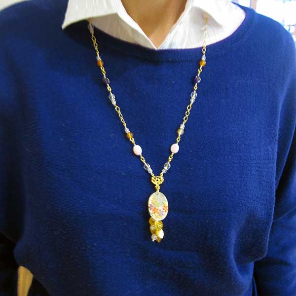 ペンダントトップの色合いにあわせた天然石がとても春らしいネックレス。