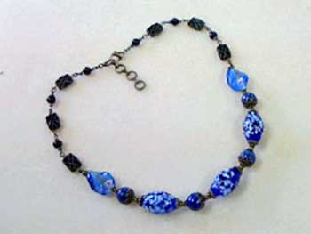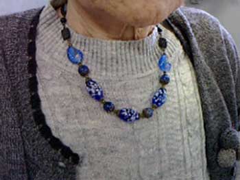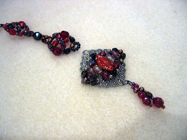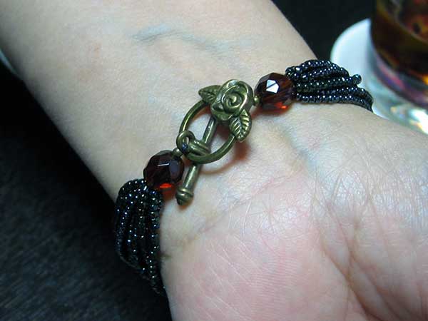 黒の絹糸にチクチクと小さいビーズを根気よく通して、留め金のマンテルにずらっと通して出来上がり!