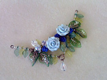浮田さん:バラの樹脂パーツや葉っぱのビーズを編みつけたネックレスを製作中です。