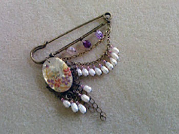 西宮さん:白蝶貝の模様入りパーツをポイントにしたカブトピンブローチを制作されました。