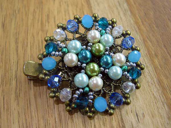 メタルパーツを使った編みモチーフのクリップブローチを制作されました。
