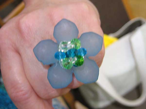 金谷さん:ビーズボールを花芯に置いた大きな花形ボタンのリングを制作されました。