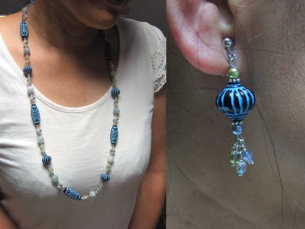 宇都本さん:青い模様入りのアクリルビーズをポイントに、大粒のアクアマリンやファイアポリッシュを使ったワイヤーのロングネックレスを制作されました。