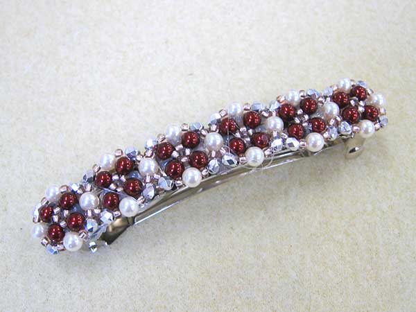 ドレスの色とお揃いの赤でまとめた花模様に編み込んだビーズのバレッタです。