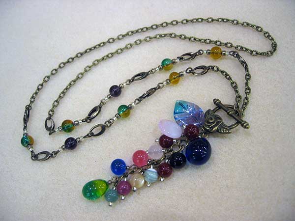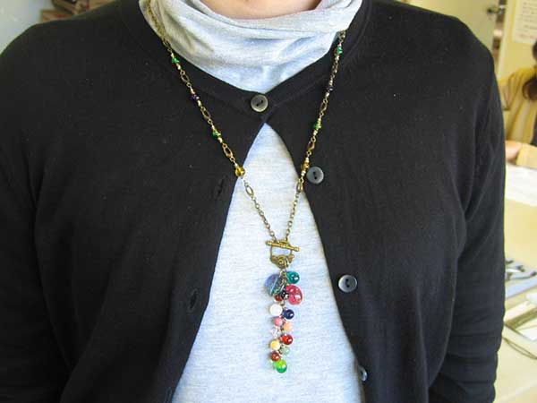 古川さん:種類の違う真鍮線付きのとんぼ玉MIXを使ったフリンジタイプのネックレスを制作されました。