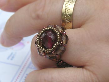 大小のファイアポリッシュと丸小特小を編み込んで作る、こざいく屋定番モチーフのリングです。