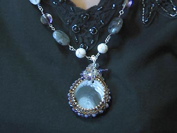 チェコビーズと丸小ビーズで、樹脂トップを包み込んだ直径4cm強のペンダントトップは、天然石で大きくつないだ豪華なネックレスと合わせて、とても存在感ある作品に仕上がっています。
