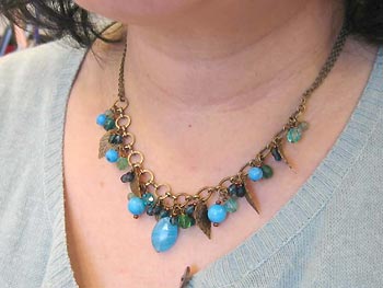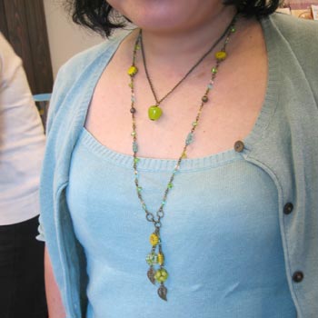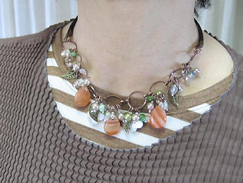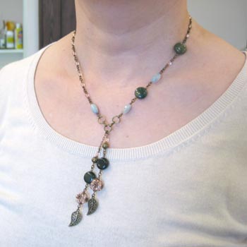 ネックレスはグリーンを基調に襟周りに葉っぱのメタルパーツがついている前面フリンジタイプ。