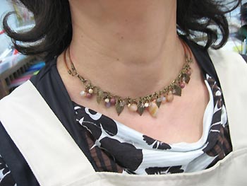 先月作ったパーツを繋いで留金具はニューホックで着けやすく。