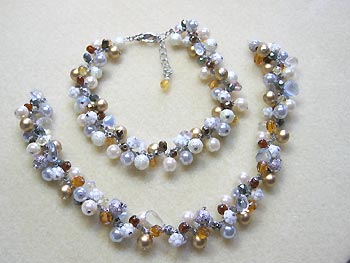 樹脂パールとチェコビーズをTピンでクルクル留付けた小枝状のネックレスとお揃いのピアスを制作されました。