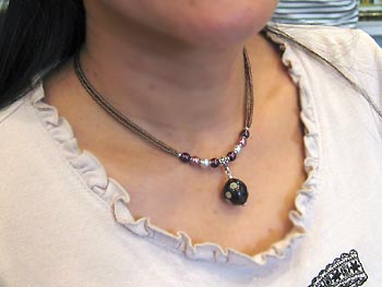 紫に小さな花模様の入ったとんぼ玉を制作、2蓮ネックレスに加工されました。