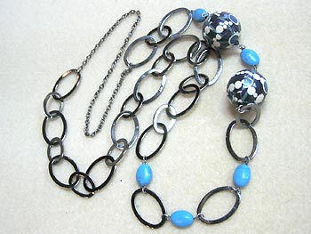手づくりの大きなパーツと大ぶりのチェーン、ハウライトターコイズをポイントに効かせたロングネックレスを制作されました。