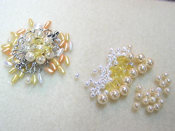 透かしパーツを土台にチェコビーズと樹脂パールのブローチを制作されました。