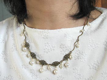 S字のメタルパーツを使ってゆらゆらおもしろい印象のネックレス、淡水パールに金と金古美のパーツを使って渋い中にもキラリと光るネックレスが仕上がりました。