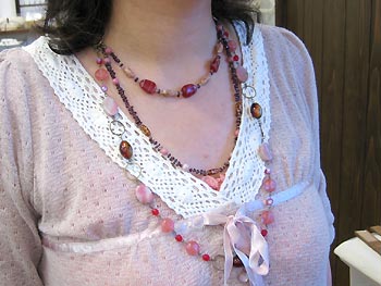 本日は基本のキットを元に制作、冠れるくらいの2蓮ロングネックレスで、ピンクを基調にガーネット色のファイアポリッシュで華やかながら渋い出来上がりです。