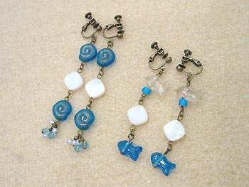 合わせて使えるようお揃いのイヤリングと、ミックスの中に入っていた魚型のビーズでもうひとつイヤリングを制作。